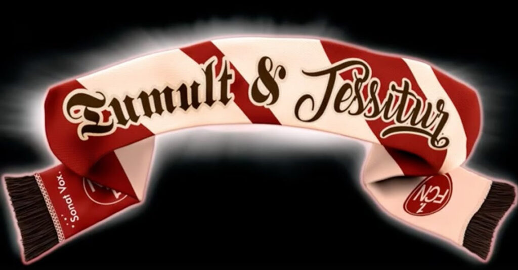 „Philip Kojo Metz‘ Grundidee erprobt mit Tumult & Tessitur das Spannungsfeld zwischen der Alltagskultur von Fangesängen im Fußballstadion und der Hochkultur komplexer, mehrstimmiger Chormusik. Seine experimentelle Leitfrage lautet: Was geschieht, wenn sich klassisch ausgebildete Künstler der vor allem durch ihre Rhythmik und Eingängigkeit gekennzeichneten Fangesänge annehmen, diese kompositorisch transponieren und mit klanglicher Präzision vortragen? Das Ergebnis, so Philip Kojo Metz, „ist ein Fest vermeintlicher Gegensätze“, ein faszinierendes Klangerlebnis von versöhnten Widersprüchen und Antagonismen. Eine betörende Vereinigung von Polaritäten, eine Synthese von scheinbaren Unvereinbarkeiten. Mit dem im Fränkischen beheimateten, international erfolgreichen Männerchor Sonat Vox gelang dem Berliner Künstler ein Glücksgriff. Durch höchste musikalische Kompetenz und virtuose gesangliche Professionalität bringen Komponist und Sänger Unerhörtes zum Klingen, in dem der Fußballfan Vertrautes wiedererkennt und auch der musikalische Kunstliebhaber zufriedengestellt wird. Zum Kunstprojekt sind eine CD mit mehreren Liedern und ein Video entstanden. Die CD zu Tumult & Tessitur ist ab Mitwoch, den 13.12.23, in den Fanshops und im Online-Fanshop des 1. FC Nürnberg für 10€ erhältlich, oder über paypal: studiophilipkojometz@gmail.com – Bitte Name und Adresse (in Deutschland) angeben!“, heißt es in der Ankündigung des Projektes. (Faszination Fankurve, 13.12.2023)