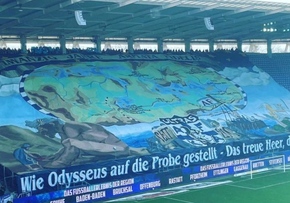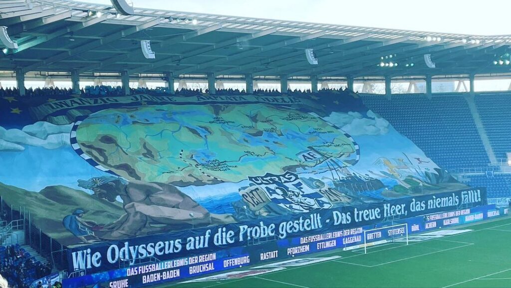 „Wie Odysseus auf die Probe gestellt – Das treue Heer, das niemals fällt!“, lautete das Motto der Aktion. Dazu wurde eine große Blockfahne ausgebreitet. Nach der Blockfahne kam ein Balkenmuster aus Zetteln in Blau, Weiß und Schwarz zum Vorschein. Außerdem wurde eine weitere Blockfahne mit dem KSC-Wappen und dem Logo der Ultragruppe ausgebreitet.