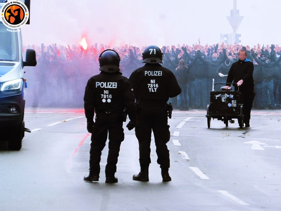Wie die Fanhilfe Hannover mitteilte, sei es schon während des Fanmarschs im Vorlauf der Partie zu Provokationen durch Polizeibeamte gekommen. Am Eingang zur Nordkurve des Niedersachsenstadions sei „es einzig und alleine der besonnenen Handlung der Fanszene durch Ansprachen zu verdanken“, dass es nicht zu einer Massenpanik gekommen sei. „Provokant im Fanmarsch platzierte Einsatzstaffeln, verzögerter und limitierter Einlass am Nordvorplatz und dutzende Beamte im Bereich der Heimkurve sorgten bereits im Vorfeld der Partie für ein angespanntes Verhältnis zwischen Fans und Polizei“, berichtete die Fanhilfe vom Geschehen am Niedersachsenstadion.