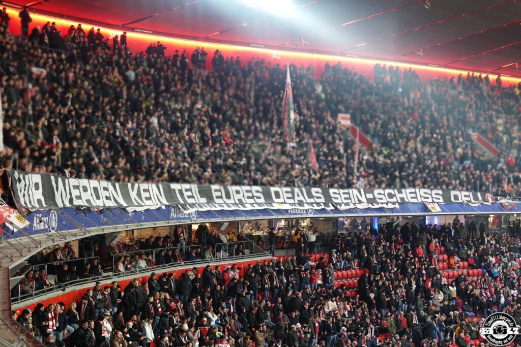„Wir werden kein Teil eures Deals sein! Nach dem erfolgreichen bundesweiten Aktionsspieltag inklusive zwölfminütigem Stimmungsboykott wollen wir dem Protest Nachdruck verleihen. Um vor der Winterpause auch in unserem Neckarstadion nochmal ein Zeichen zu setzen, führen wir den Protest gegen einen Investoreneinstieg in der DFL fort. Daher werden wir gegen den FC Augsburg erneut die ersten zwölf Spielminuten schweigen und keinen Support organisieren!“, teilte die Cannstatter Kurve dazu mit. (Faszination Fankurve, 20.12.2023)