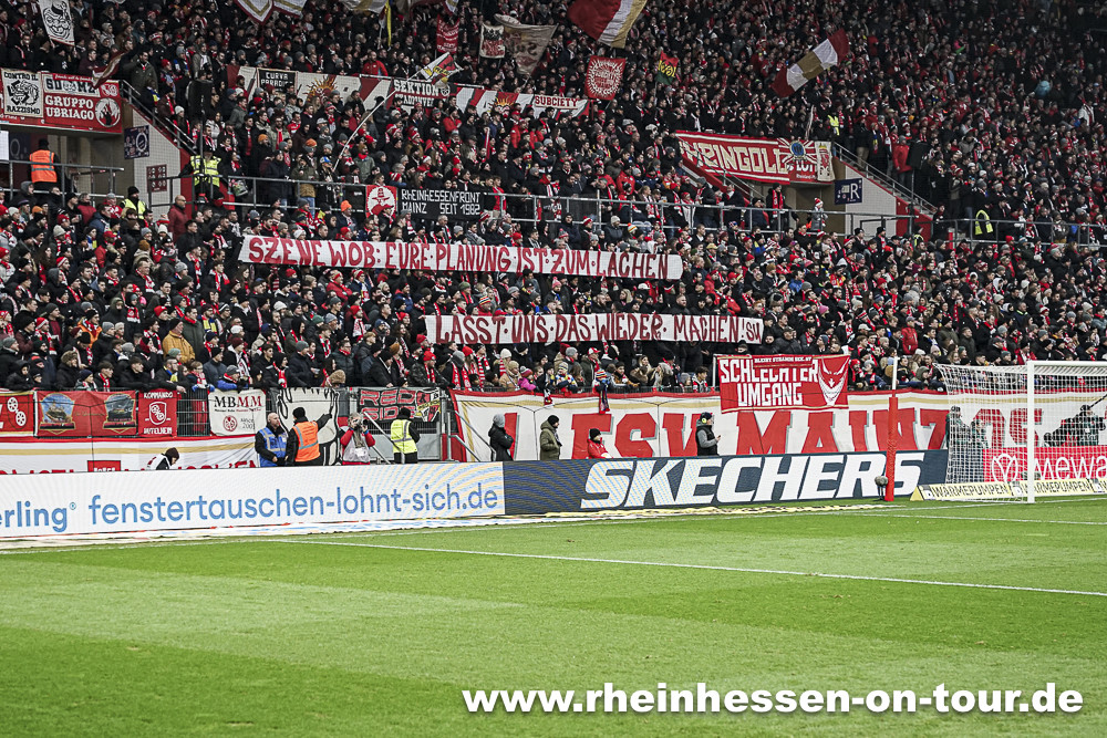 Im zentralen, unteren Bereich der Rheinhessentribüne trat beim gestrigen Heimspiel gegen Wolfsburg eine weitere neue Gruppe in Erscheinung. Hinter einer Zaunfahne mit der Aufschrift Schlechter Umgang versammelten sich sportlich orientierte Fans der Rheinhessen, die sich neben der Zaunfahne auch durch ein „Szene Wob: Eure Planung ist zum Lachen – Lasst uns das wieder machen!“-Spruchband in Richtung der Fanszene des VfL Wolfsburg bemerkbar machte. Beim „Figli Della Stessa Rabbia“-Hallenturnier 2024 hing Anfang des Jahres bereits eine Zaunfahne der Gruppe Schlechter Umgang.
