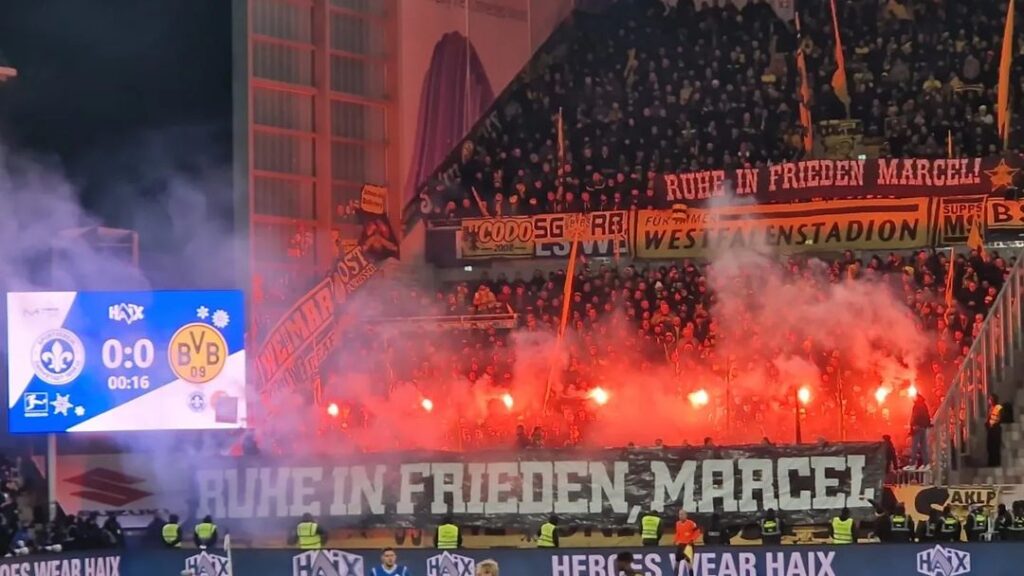 Zu Beginn des Samstagabendspiels der Bundesliga zwischen dem SV Darmstadt 98 und Borussia Dortmund gedachten die BVB-Ultras mit Spruchbändern und Bengalischen Fackeln, an den kürzlich verstorbenen BVB-Ultra Marcel.