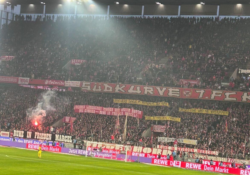 Auch auf der gegenüberliegenden Südtribüne Darmstadt wurde am gestrigen Samstagabend ein Plakat in Gedenken an Marcel hochgehalten. „Ultras sterben nie“, war dort neben einer „Ruhe in Frieden“-Botschaft in Gedenken an Marcel zu lesen. In der Kölner Südkurve zeigten am Samstagnachmittag ebenfalls mehrere Kölner Ultragruppen Plakate für den verstorbenen BVB-Ultra. „Dein Herz schlug im Rhythmus der Kurve – Dieses Echo wird nie verstummen – Ruhe in Frieden, Marcel!“ und „Deinen Lebensmut tragen wir weiter durch die Stadien – Ruhe in Frieden Marcel“, war dabei u.a. zu lesen. Dazu wurde auch eine Bengalische Fackel entzündet. Am Freitagabend war in der Südkurve München bereits ein Spruchband für den verstorbenen BVB-Fan zu sehen. (Faszination Fankurve, 14.01.2024)