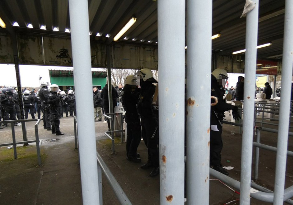 Während das Spiel bereits einige Minuten lief, warteten noch hunderte Fans vor den Toren auf Einlass. Als Begründung wurde eine besondere polizeiliche Präsenz im Bereich der Materialkontrolle genannt. Durch diese willkürliche Maßnahme verzögerte sich der Einlass deutlich. Über nachrückende Zuschauer auf dem Vorplatz und in einer immer hektischeren Stimmung agierte die Polizei ohne Absprache auf dem Vereinsgelände des SC Preußen, sperrte Eingänge, kesselte wahllos Preußenfans ein, um sie wenig später dann doch wieder passieren zu lassen. Kurzum: Es regierte das Chaos in einer völlig unkoordinierten Einlasssituation. Eine aggressive Polizeieinheit schwang sich dazu auf, Tickets zu kontrollieren und anlasslos Personalien aufzunehmen. Sichtlich überfordert wurden in dieser Situation unterschiedliche Preußenfans aus allen Teilen des Stadions von der Polizei gestoßen und bedroht. Nur der außerordentlichen Besonnenheit der Preußenfans ist es zu verdanken, dass keine Massenpanik mit schlimmeren Folgen entstand. Vereinsvertreter von Preußen Münster, Fanszene, der FANport, die Fanhilfe und viele andere versuchten verzweifelt, die Situation zu entschärfen. Dies wurde aber vom Einsatzleiter abgelehnt, der bezeichnenderweise gar nicht vor Ort war und sein warmes Büro vorzog.