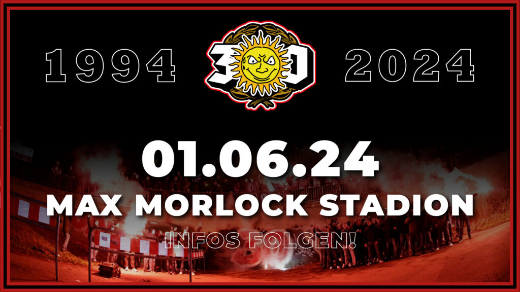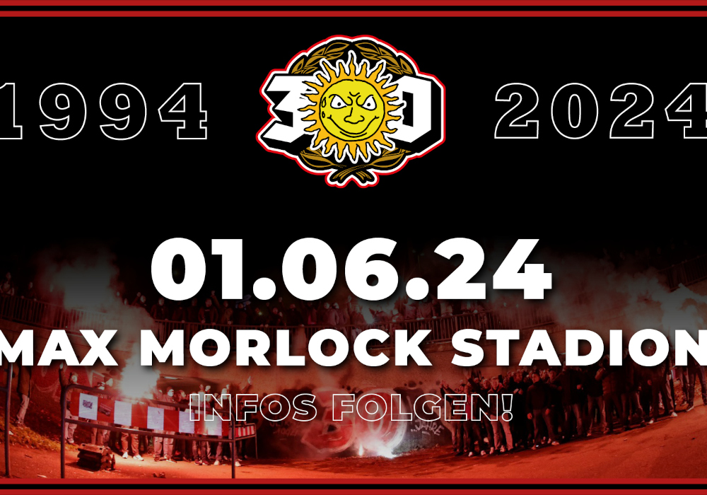 Die 1994 gegründeten Ultras Nürnberg haben am Montag das Jubiläumsdatum zu 30 Jahren Ultras Nürnberg veröffentlicht. Gefeiert wird demnach nach Saisonende am 1. Juni 2024 im Max-Morlock-Stadion. Weitere Infos werden laut Mitteilung noch folgen. (Faszination Fankurve, 30.01.2024)