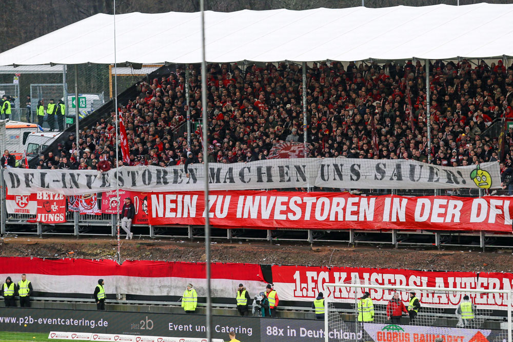„DFL-Investoren machen uns sauer!“, war im Gästeblock zu lesen, bevor vermummte FCK-Fans Zitronen auf das Spielfeld warfen. Die Aktion führte zu einer fünfminütigen Spielunterbrechung. Zuvor präsentierten die FCK-Fans beim Nachbarschaftsduell noch die bereits bekannte „Gemeinsam zum Klassenerhalt – Gemeinsam unzerstörbar!“-Botschaft.