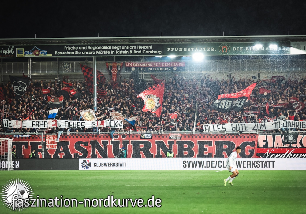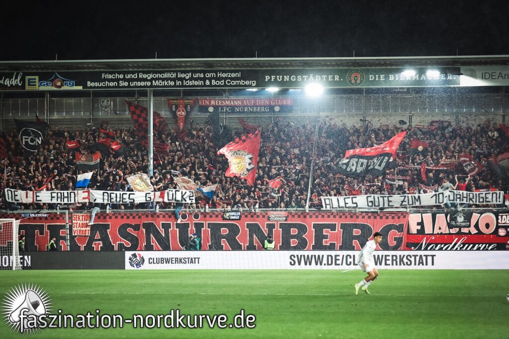 „Neue Fahne, neues Glück? Alles gut zum 10-Jährigen!“, war auf einem Spruchband der Ultras Nürnberg im Gästeblock in Wiesbaden zu lesen. Drei Buchstaben des Spruchbands wurden dabei durch Teile der geklauten Südkurve-Fahne ersetzt.