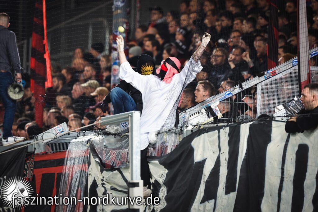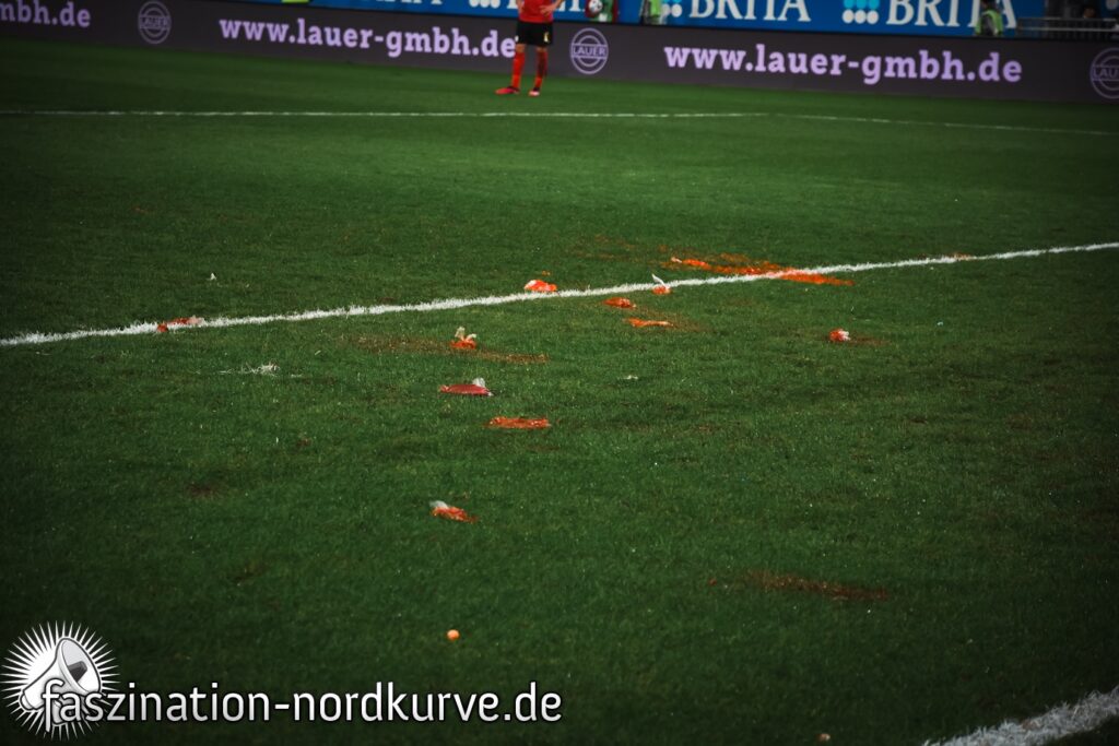 Außerdem sorgten die FCN-Fans mit Protesten gegen die Investoren-Pläne der DFL für eine Unterbrechung des Zweitligaspiels. „Rote Linie – Erhalt von 50+1“, lautete dabei die Botschaft der FCN-Ultras. Spruchbänder richteten sich zudem an die Finanzunternehmen Blackstone und CVC, die noch im Rennen um die Beteiligung an der DFL-Tochter sind. Als Scheichs verkleidete FCN-Ultras thematisierten dabei erneut den Einfluss von Saudi-Arabien in diesen Unternehmen und warfen symbolisch Blut auf das Spielfeld. (Faszination Fankurve, 10.02.2024)