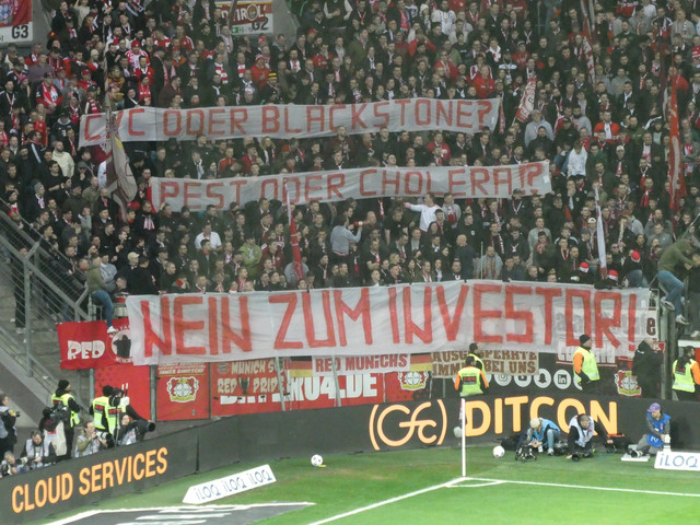 Die Ultras des FC Bayern München thematisierten auf Spruchbändern im Gästeblock zudem die Finanzunternehmen, die für den Investoren-Deal der DFL noch in Frage kommen: „CVC oder Blackstone? Pest oder Cholera!? Nein zum Investor!“, war dort zu lesen. Später brannten im Gästeblock immer wieder Bengalische Fackeln.