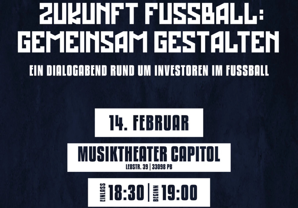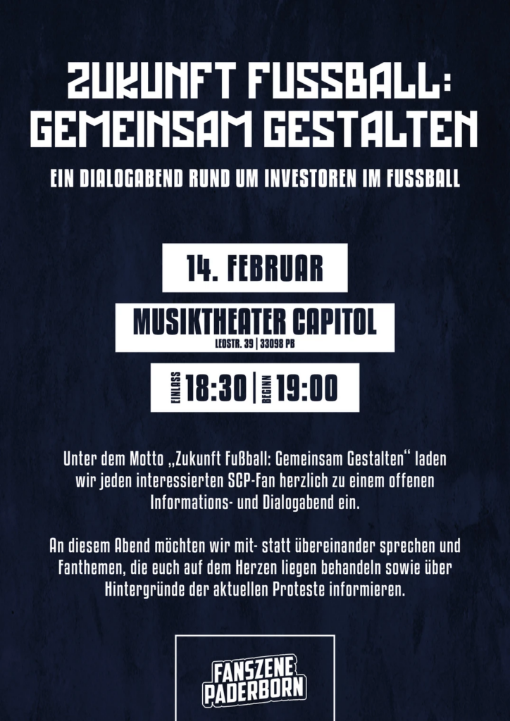 Die Fanszene Paderborn veranstaltet heute Abend (14. Februar) um 19:00 Uhr einen Dialogabend rund um das Thema Investoren im Fußball. Dazu sind alle interessierten SC Paderborn-Fans zu einem offenen Austausch ins Musiktheater Capitol in Paderborn eingeladen, heißt es in einer Mitteilung der Supporters Paderborn. Im Zuge dessen möchte die Fanszene auch über die Hintergründe der aktuellen Proteste informieren. (Faszination Fankurve, 14.02.2024)
