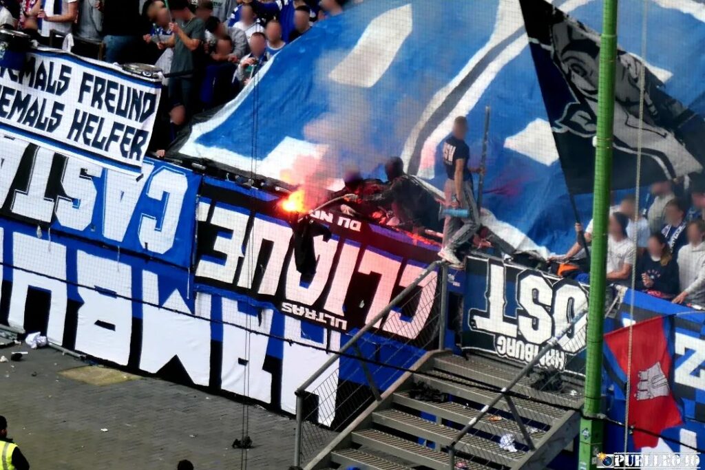 Beim gleichen Spiel hing über der Zaunfahne der Clique du Nord auf der Nordtribüne Hamburg eine Fahne, auf der ein Polizeihelm mit kaputtem Visier und Blut abgebildet war. Polizei und Staatsanwaltschaft nahmen dies zum Anlass, eine Durchsuchung durchzuführen. Mittwochnachmittag kam es auf Anordnung der Staatsanwaltschaft zu Durchsuchungen eines Raumes im Volksparkstadion, der von den HSV-Ultras zum Lagern von Fahnen genutzt wird. Demnach kam es wegen der Fahne, die beschlagnahmt wurde, zu Ermittlungen wegen des Verdachts des öffentlichen Aufrufs zu Straftaten.