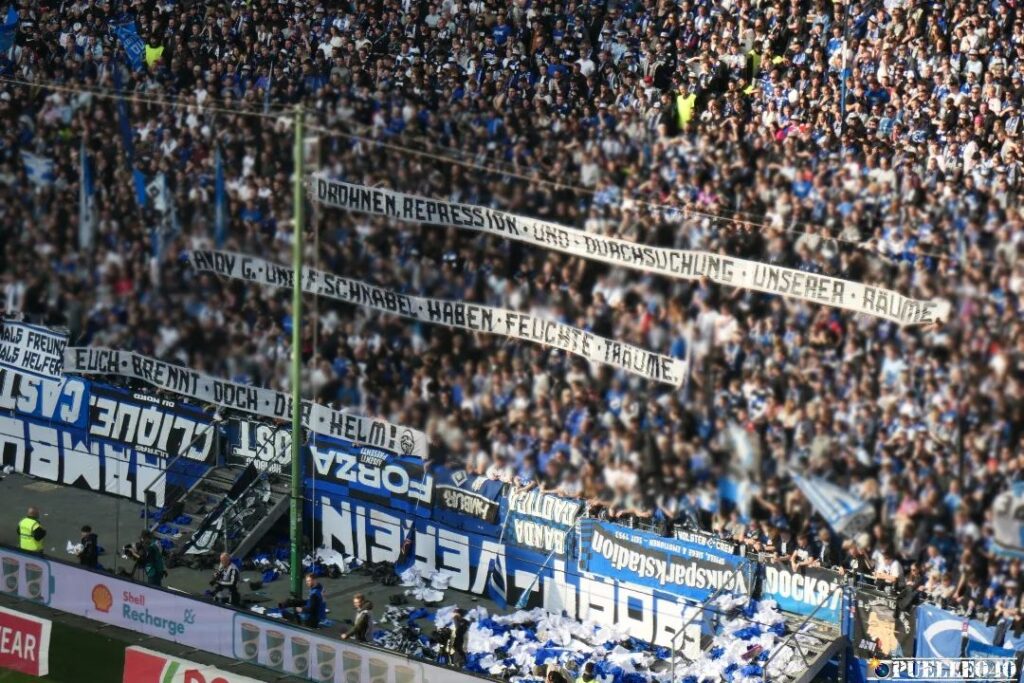 Dazu wurde eine Blockfahne mit „ACAB“-Schriftzug auf der Nordtribüne ausgebreitet. „Drohen, Repressionen und Durchsuchung unserer Räume – Andy G. und F. Schnabel haben feuchte Träume. Euch brennt doch der Helm!“, stand dort außerdem auf einem Spruchband geschrieben.