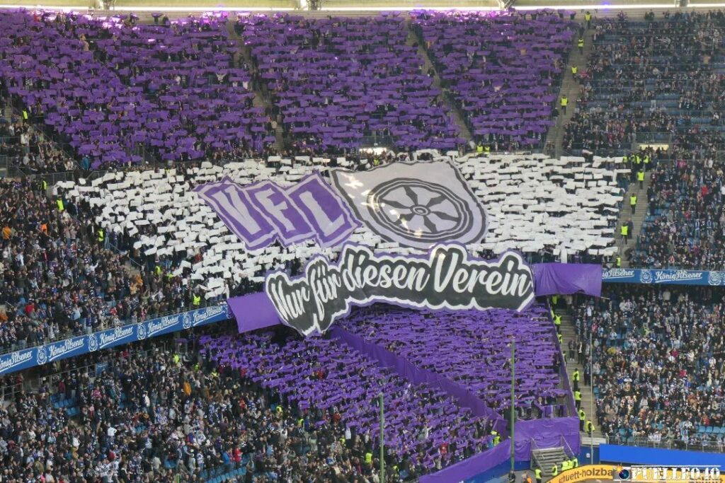 im Block der etwa 6.000 VfL Osnabrück-Fans konnte man hingegen eine „Nur für diesen Verein“-Choreografie bestaunen. Auf einer Blockfahne war dabei das Vereinswappen neben dem Stadtwappen von Osnabrück abgebildet. Im Hintergrund hielten die Gästefans violette und weiße Zettel hoch. In der ersten Reihe des Oberrangs wurden dazu Bengalische Fackeln entzündet.