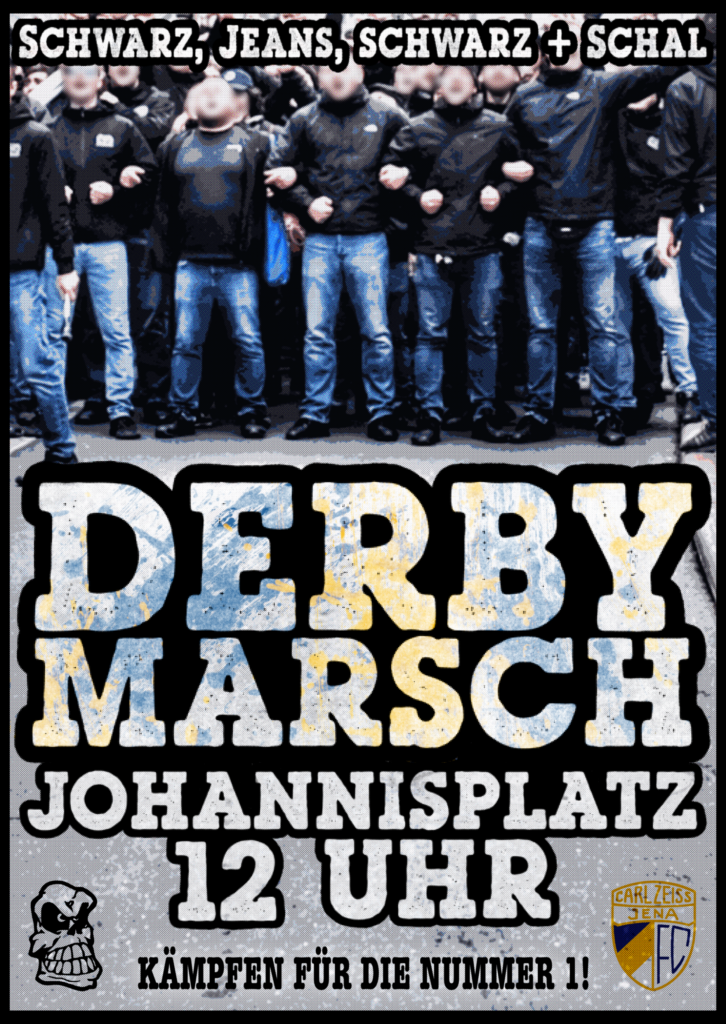 „Die Nr. 12 trifft sich am Derby-Tag um 12 Uhr auf dem Johannisplatz. Schwarz, Jeans, schwarz und FCC-Schal nicht vergessen. Kämpfen für die Nr. 1!“, heißt es im Aufruf der FCC-Ultras. Die Fans des FC Carl Zeiss Jena wollen vom Johannisplatz in der Innenstadt von Jena gemeinsam zum Ernst-Abbe-Sportfeld ziehen und dabei einheitlich in schwarzen Schuhen und schwarzer Oberbekleidung, blauen Jeans sowie FCC-Schals auftreten.