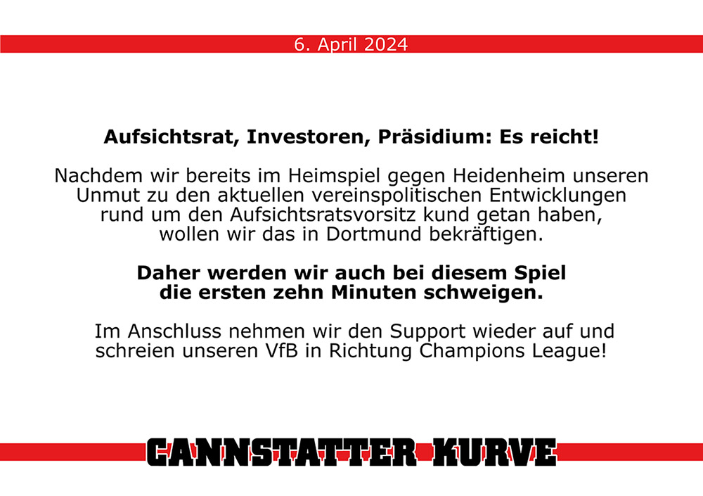 „Aufsichtsrat, Investoren, Präsidium: Es reicht! Nachdem wir bereits im Heimspiel gegen Heidenheim unseren Unmut zu den aktuellen vereinspolitischen Entwicklungen rund um den Aufsichtsratsvorsitz kund getan haben, wollen wir das in Dortmund bekräftigen. Daher werden wir auch bei diesem Spiel die ersten zehn Minuten schweigen. Im Anschluss nehmen wir den Support wieder auf und schreien unseren VfB in Richtung Champions League!“, teilte die Cannstatter Kurve dazu am heutigen Samstagmorgen mit.