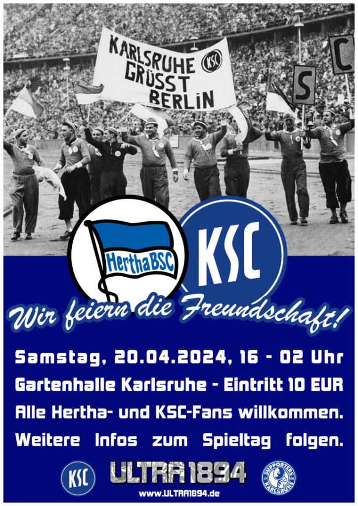 Einen Tag bevor der Karlsruher SC am 21. April 2024 Hertha BSC im heimischen Wildparkstadion empfängt, feiern die Fanszenen beider Vereine ihre Fanfreundschaft. Von 16:00 Uhr bis 02:00 Uhr laden die KSC-Ultras und Gegengerade Karlsruhe alle Fans beider Lager in die Gartenhallte in Karlsruhe ein. (Faszination Fankurve, 06.04.2024)