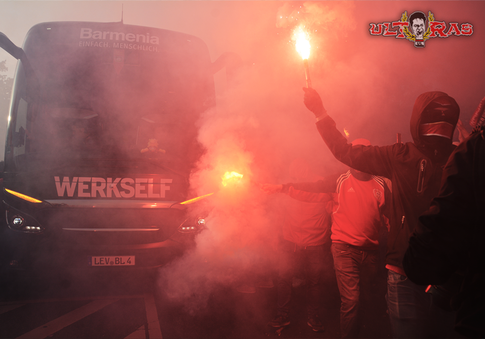 Bayer 04 Leverkusen kann mit einem Heimsieg gegen Werder Bremen am Sonntag aus eigener Kraft erstmals deutscher Meister werden. Vor großen Heimspielen machte der Nordkurve 12-Dachverband regelmäßig für einen großen Busempfang auf der Bismarckstraße mobil.