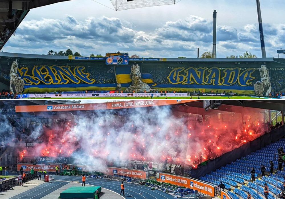 „Keine Gnade“, lautete das Motto der Aktion in der Südkurve, die von Löwen eingerahmt wurde. „Hannover“ stand hingegen vorm Gästeblock geschrieben. Dahinter schwenkten die Gästefans Fahnen mit dem 96-Wappen, Ultras zündeten dazu noch reichlich grünen Rauch. Dazu trugen die Hannover 96-Fans Plastikponchos, die ein Streifenmuster in Grün und Schwarz ergaben. Durch den Rauch wurde die Zweitligapartie mit etwas Verspätung angepfiffen.