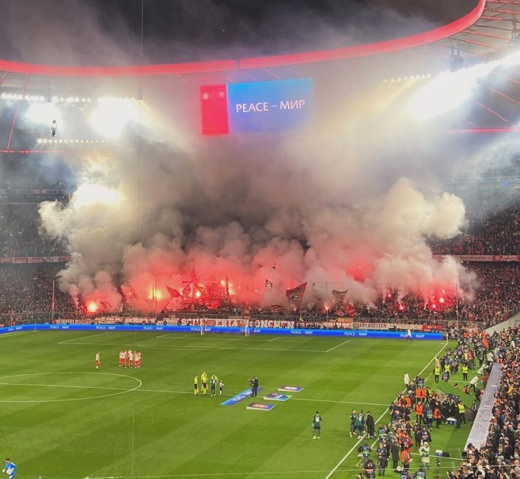 Ultras des FC Bayern München leiteten das heutige Rückspiel im Viertelfinale der Champions League gegen Arsenal FC mit einer großen Pyroshow in der Südkurve ein. Die FC Bayern-Fans protestierten damit gegen die UEFA, die FC Bayern-Fans beim Hinspiel in London ausschloss.