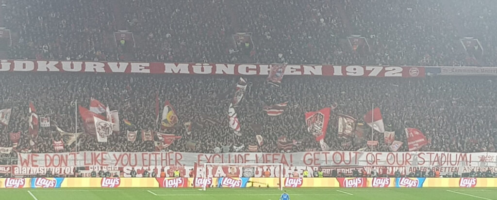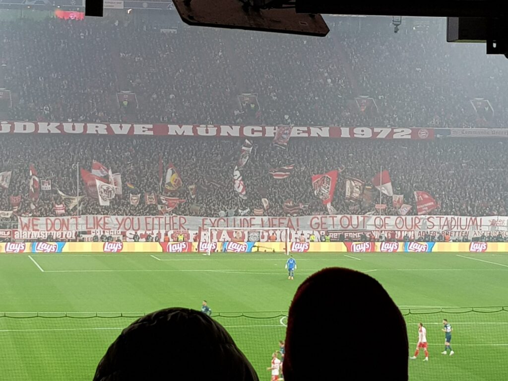 „WE DON’T LIKE YOU EITHER, EXCLUDE UEFA! GET OUT OF OUR STADIUM!“ (Wir mögen euch auch nicht, schließt die UEFA aus! Raus aus unserem Stadion!) stand nach der Pyroshow mit blinkenden Stroboskopen vor der Südkurve München geschrieben. Auch im Gästeblock der Arsenal FC-Fans wurde Pyrotechnik abgebrannt.