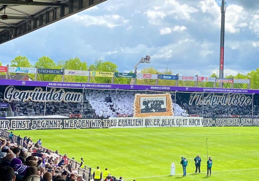 „Gegründet am 17. April 1899 – Was ihr einst gebannt, werden wir treu erhalten! Unser Blick geht nach vorn – doch unser Dank gilt den Alten!“, lautete das Motto des 1. Teils der zweiteiligen Aktion, bei der ein Foto des FC 1899 Osnabrück ebenso abgebildet. Im zweiten Teil kamen zwei Traditionstrikots zum Vorschein. „Auf ewig Lila-weiß – Verein für Leibesübungen von 1899 e.V. Osnabrück“, stand jetzt in der Heimkurve geschrieben. Die Mannschaft des VfL Osnabrück lief passend zum Jubiläum in eben jenen Traditionstrikots mit dem Osnabrücker Rad auf der Brust auf.