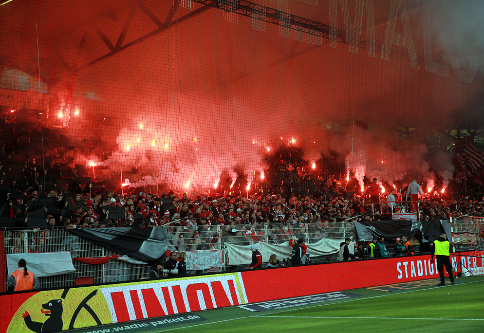 Die Aufnäher zeigten dabei das Wappen von Union, aber auch einen Schriftzug der Sottocultura Ultras, mit denen die HammerHearts eine Freundschaft pflegen. Im Hintergrund schwenkten die FCU-Fans rot-weiße Fahnen und hielten schwarze Pappen hoch. Anschließend kam auf der Waldseite noch reichlich Pyrotechnik zum Vorschein.