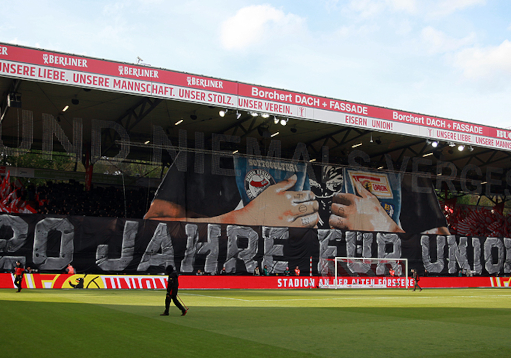 Beim Heimspiel des 1. FC Union Berlin gegen den FC Bayern München wurde am Samstagabend auf der Waldseite des Stadions an der Alten Försterei zwei Jahrzehnte HammerHearts gefeiert. Am Dach der Tribüne wurde eine Fahne mit einem Kuttenträger hochgezogen.