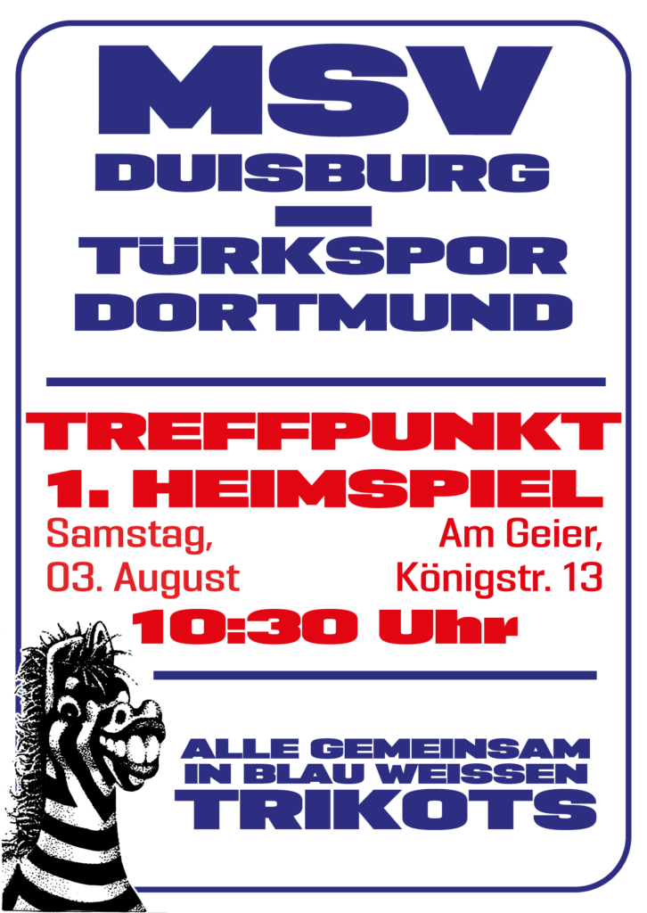 Am 03. August 2024 bestreitet der MSV Duisburg das erste Heimspiel der Regionalliga West-Saison 2024/25 gegen Türkspor Dortmund. Die Kohorte Ultras rufen alle Fans der Zebras auf, am Spieltag im MSV-Trikot zum Treffpunkt in der Innenstadt zu kommen.