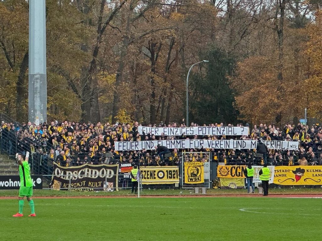 Mit einem „Euer einziges Potenzial? Feuer und Flamme für Verein uns Material!“-Spruchband reagierte das Wagnerstadt Kollektiv aus Bayreuth am 16. November 2024 beim Oberfranken-Derby zwischen Bamberg und Bayreuth auf die Auflösung innerhalb der Fanszene aus Bamberg.