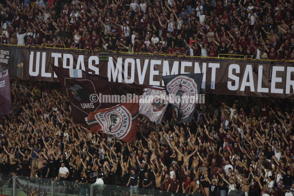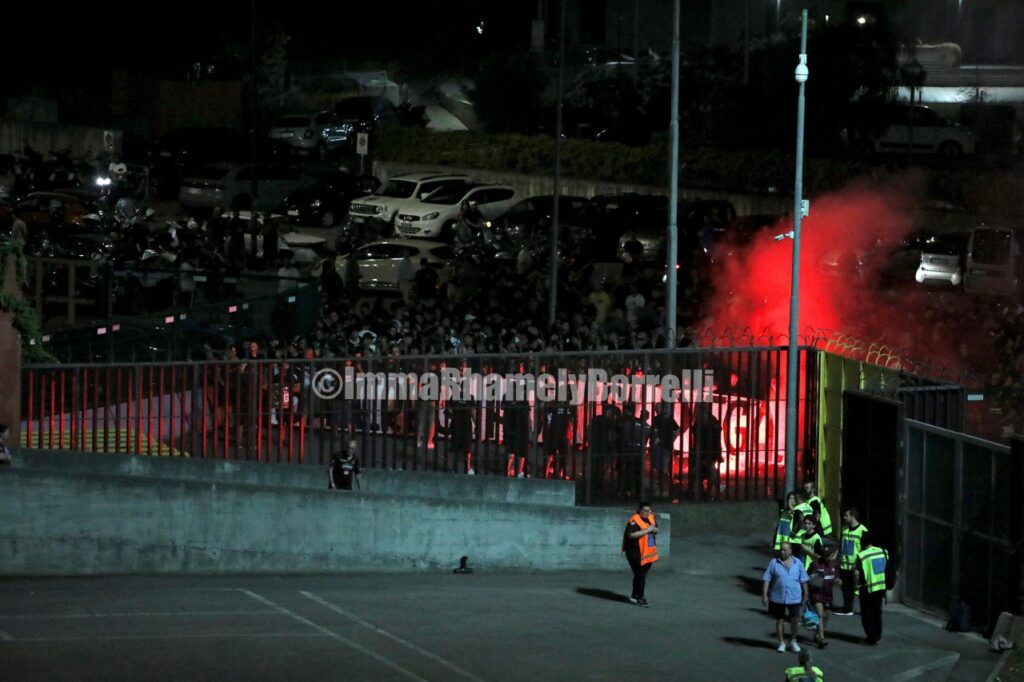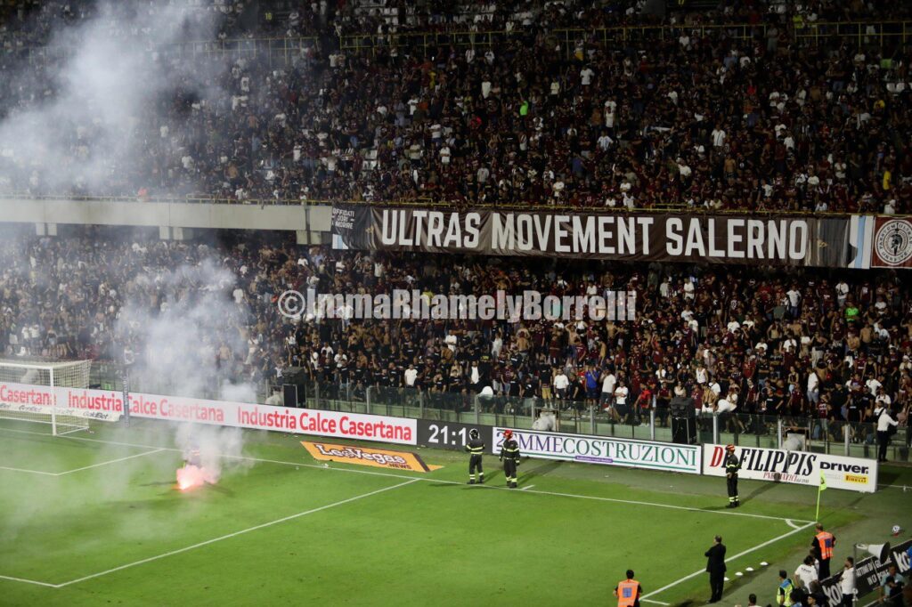 Die heimische Szene ist aufgrund ideologischer Entscheidungen und unterschiedlicher Herangehensweisen gespalten. Eine Gruppe protestiert draußen, die andere ist drinnen, präsent und motiviert, Salernitana zu retten. (Anm. d. Red., im Stadion war nur die Gruppe Ultras Movement Salerno, kurz UMS und die Vereinigung Costiera al Seguito).