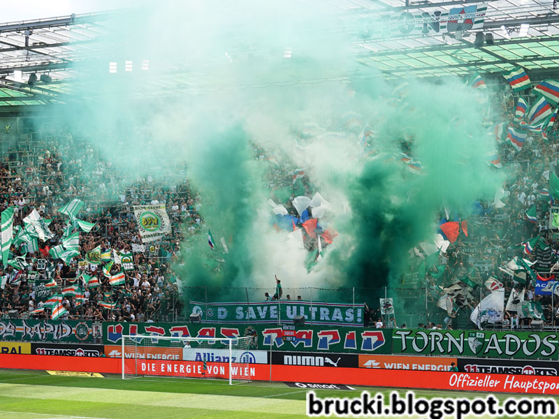 Der Block West startete die Partie mit einem groß angelegten Fahnen-Intro, begleitet vom Kurvenhit „Seht ihr die Fahnen weh’n“. Im Bereich der Ultras Rapid stieg zusätzlich hinter einem „God save Ultras“-Banner grüner Rauch auf.