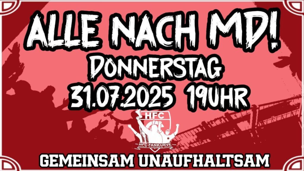 Obwohl das erste Auswärtsspiel der Hallenser in der Saison 2025/2026 an einem Donnerstag-Abend stattfindet, mobilisiert die Fanszene der Gäste nun unter dem Motto „Auf ins Dorf!“ für die Begegnung in Magdeburg. Die Fanszene des HFC ruft alle HFC-Fans dazu auf, zahlreich anzureisen und lautstark die erhofften nächsten drei Punkte zu feiern.