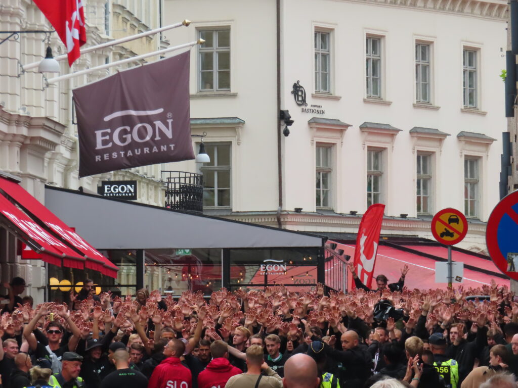 Beide Seiten trafen sich im näheren Umkreis des zentral in der Stadt gelegenen Stadions und stimmten sich mit Gesängen und ein wenig Pyro auf das Spiel ein.