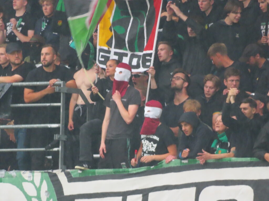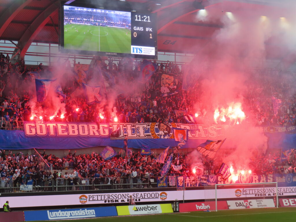 Zahlenmäßig bestand trotz Auswärtsspiel ein kleines Übergewicht auf Seiten von IFK. So konnte man zu Beginn auch ein wenig lautstärker ins Spiel starten, wobei beide Seiten zu Beginn auf hohem Niveau agierten. Bereits nach wenigen Minuten fiel das einzige Tor des Abends für IFK, welches sichtlich emotional bejubelt wurde. Im zentralen Bereich der Kurve, außer hinter der Fahne der Ultras Göteborg, gingen zum Tor einige Fackeln an. Das Spielglück blieb IFK mit einem verschossenen Elfmeter vor der eigenen Kurve erhalten und so entwickelte sich die Stimmung der beiden Kurven zum Ende der ersten Halbzeit deutlich auseinander. IFK konnte sein hohes Niveau, mit teils immenser Intensität, dauerhaft halten, während GAIS doch spürbar nachließ.
