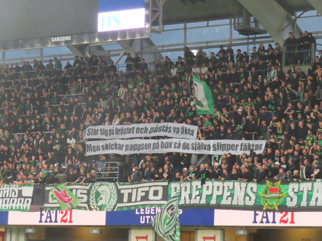 Spruchbänder gab es lediglich von GAIS. An Ultras Göteborg richtete man: „Sich selbst auf die Brust schlagen und behaupten echt zu sein – aber schickt die Alten in die Kiste, damit sie nicht kämpfen müssen.“ Zudem gab es ein Dankesspruchband für einen Spieler, die in der letzten Woche GAIS verlassen hat.