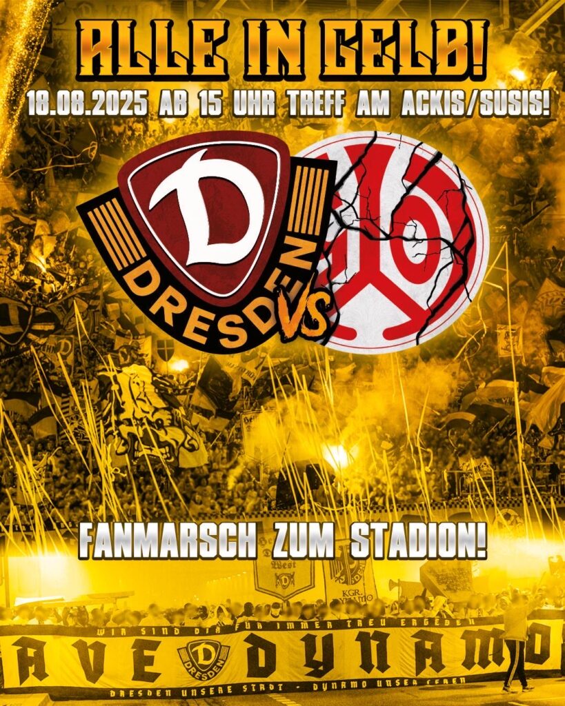 Ultras Dynamo ruft die Dresdner Fangemeinde auf, sich ab 15 Uhr am Ackis/Susis zu treffen. Alle in Gelb, und im Fanmarsch geht es zum Stadion.