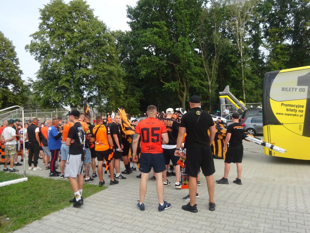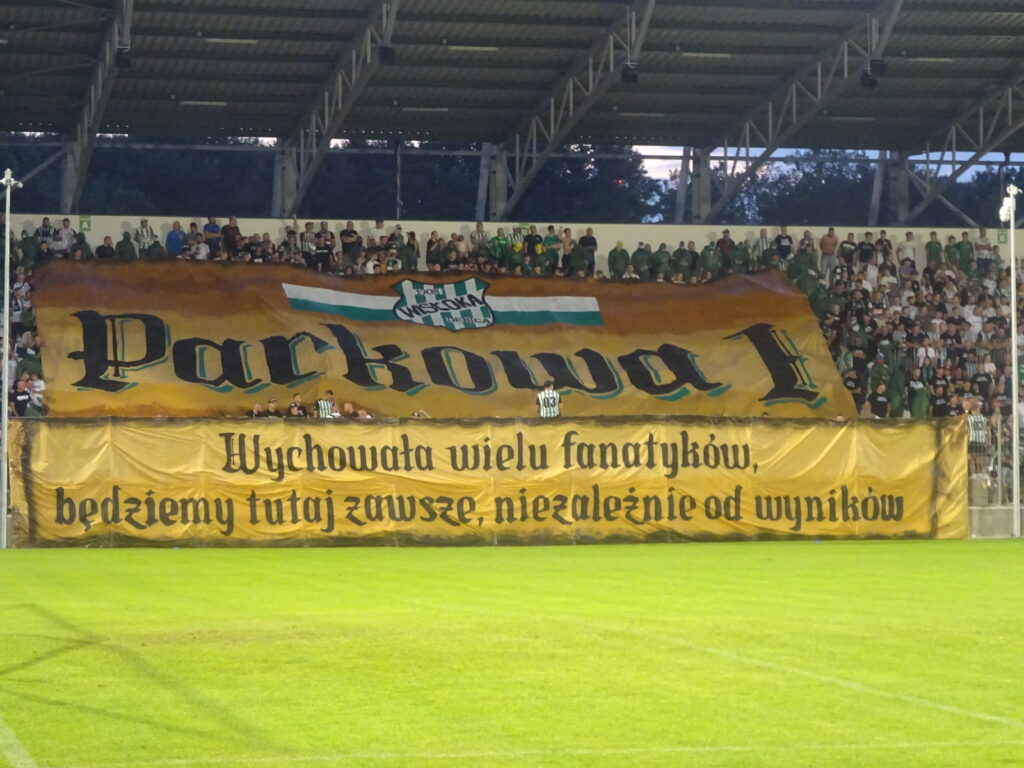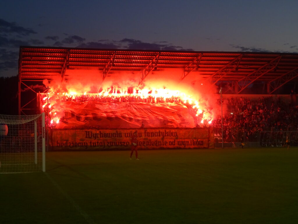 Ein Spruchband mit der sinngemäßen Botschaft „Wir haben viele Fans und werden immer hier sein, unabhängig von den Ergebnissen“ hing bereits Stunden vor Anpfiff am Block. Dazu gab es eine große Blockfahne mit Vereinslogo und dem Schriftzug „Parkowa 1“, der Adresse des Stadions. Wenig später wurden davor mehrere Vulkane gezündet, während sich ringsherum rote Fackeln über den Block verteilten. Der Abendhimmel von Dębica leuchtete in kräftigem Rot, bevor anschließend eine Rauchshow in Weiß und Grün die gesamte Tribüne einhüllte.