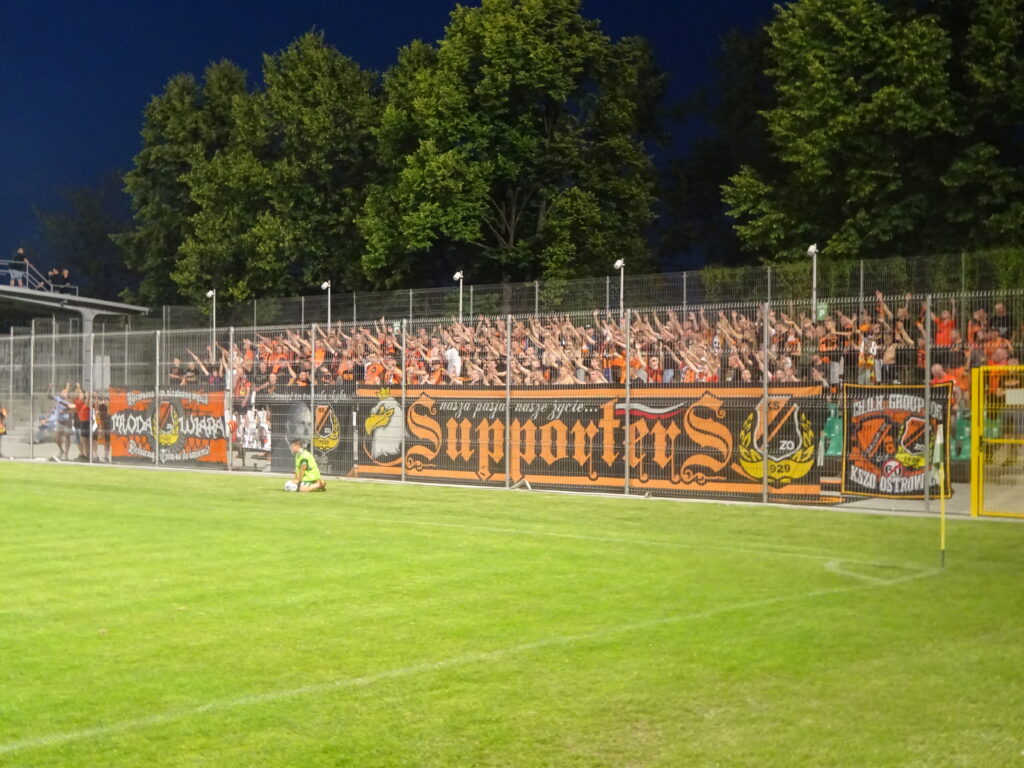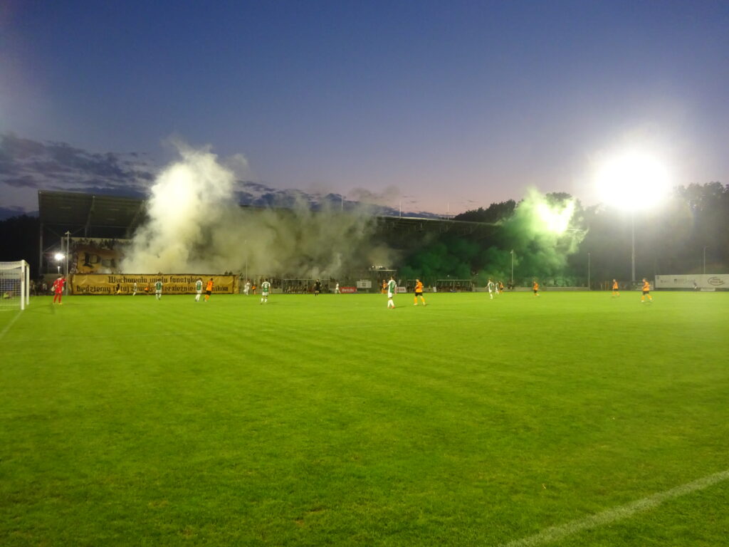 Danach wich das Spruchband den Zaunfahnen von Wisłoka. Auch die Freunde von Górnik Zabrze, mit denen seit 1988 eine Fanfreundschaft besteht, waren in großer Zahl vertreten. Sie hatten gleich zwei Zaunfahnen dabei, die zur Halbzeit getauscht wurden. In der zweiten Hälfte erreichte die Heimkurve stellenweise eine beachtliche Lautstärke – spätestens, als hinter der Tribüne ein kleines Feuerwerk gezündet wurde. Zur Melodie von „Heaven Is a Place on Earth“ steigerte sich die Kurve regelrecht in den Gesang hinein und lieferte einen der lautesten Momente des Abends.