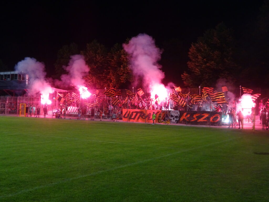 Nicht unerwähnt bleiben sollen die Gäste aus Ostrowiec. Auch sie hatten für die Fahrt nach Dębica mobil gemacht und waren mit zwei Bussen sowie zahlreichen Autos angereist. Rund 150 Kibice der Orange-Schwarzen fanden sich im Gästeblock ein. Ihr Intro erfolgte in der zweiten Halbzeit: Zunächst ging eine große Blockfahne nach oben, wurde nach einigen Momenten wieder heruntergelassen, woraufhin mehrere Schwenkfahnen in die Höhe gingen. Kurz darauf folgten Fackeln und Blinker, die den gesamten Gästeblock erleuchteten.