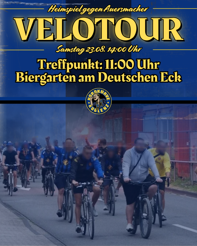 Trotz sportlicher Bedeutungslosigkeit in Liga 5 setzt sich die Nordkurve Koblenz immer wieder eigene Highlights im Rahmen der Spiele von TuS Koblenz. So auch zum nächsten Heimspiel, zu dem sie zu einer gemeinsamen Velotour mobilisiert.