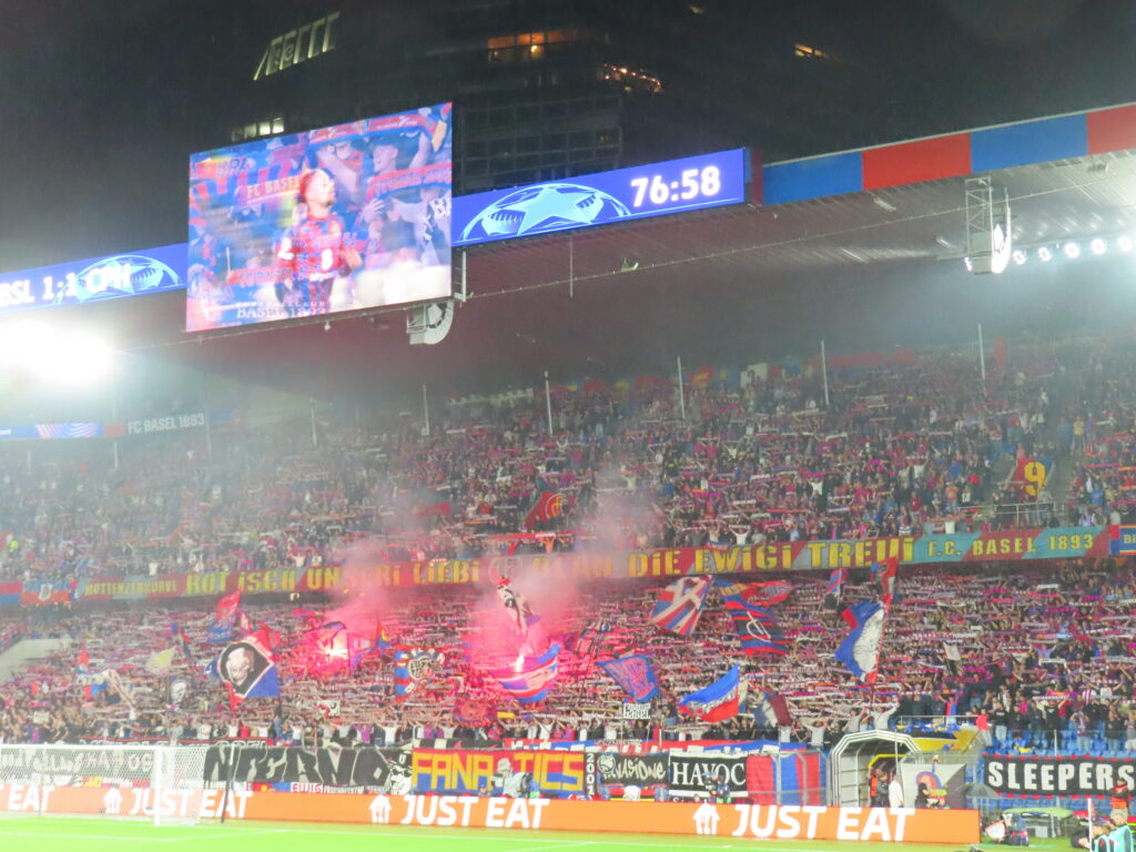 Entsprechend schwer taten sich die 300 bis 400 Gäste sich Gehör zu verschaffen. Hinter den drei Fahnen „København“, „UC“ und „Ultras“ begann bereits eine halbe Stunde vor Spielbeginn lautstark zu singen. Über 90 Minuten zeigte man gerade im Kern eine sehr hohe Intensität und sang nicht nur die Zeit vor dem Spiel komplett durch, auch in der Halbzeit wurde, unterstützt vom Ausgleich in der Nachspielzeit der ersten Halbzeit, keine Pause eingelegt. Sehr lange und mehrmals wieder aufgenommen wurde dabei eine Lied auf „Loco Tu Forma De Ser“ gesungen, welches in Deutschland besonders von Red Kaos bekannt ist. Sobald die Muttenzerkurve aber in gewohnt hoher Lautstärke sang, waren die Gäste kaum zu vernehmen.