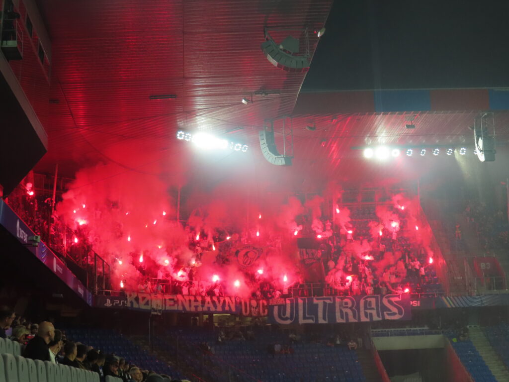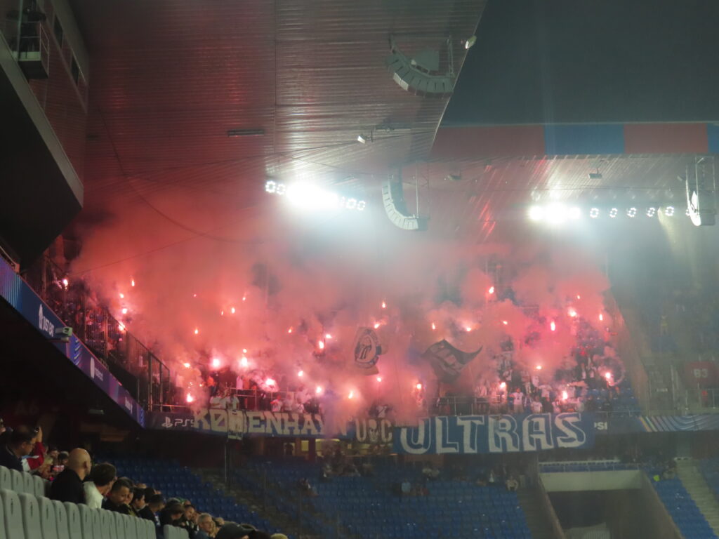 Kopenhagen erhielt Unterstützung von Ultras des Hamburger SV. Dazu hing die kleine Rauten-Fahne und der KBHSV-Schwenker war auch zu sehen. Auf Seiten von Basel war Cattiva Brunsviga mit Fahne präsent.