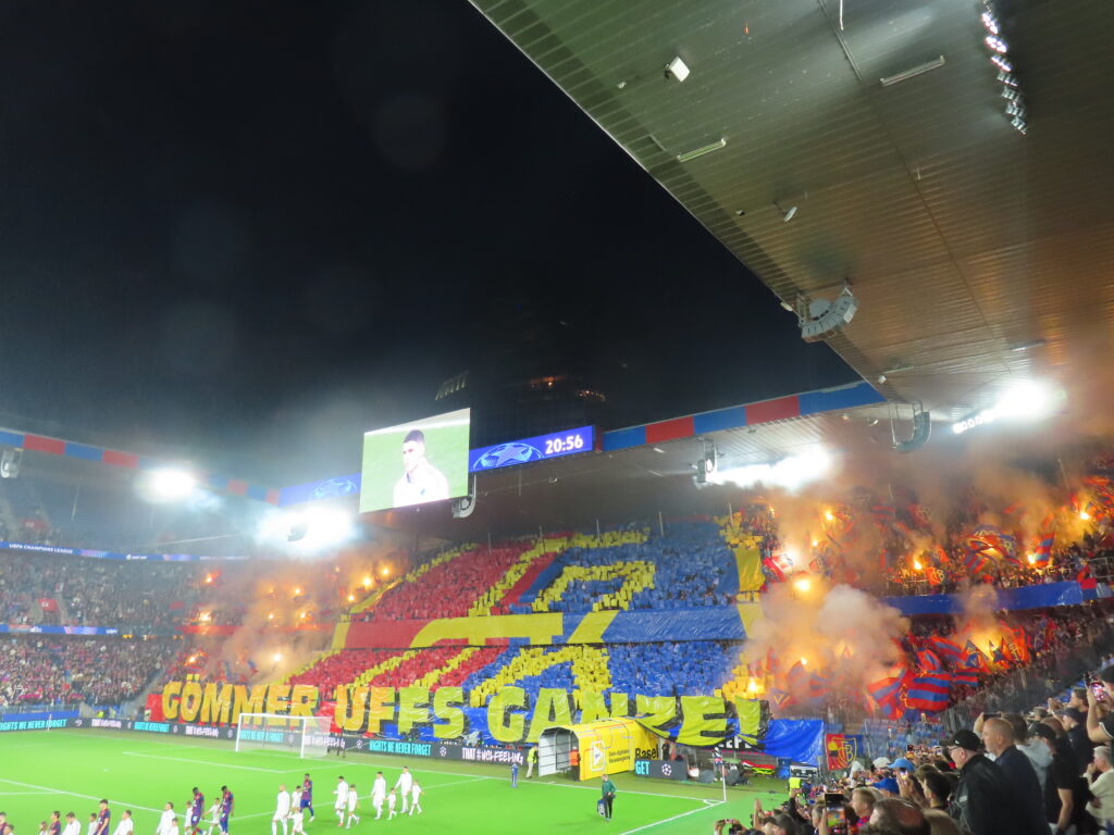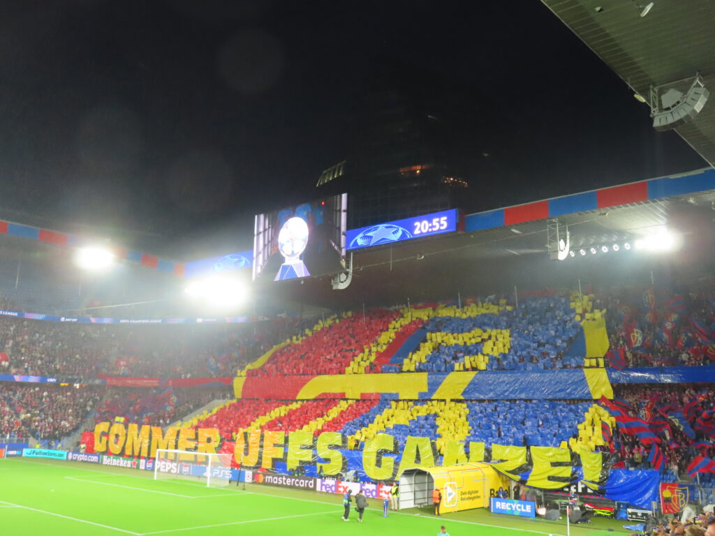 Kurz vor Ende zeigte die Muttenzerkurve noch ein Spruchband hinsichtlich der Stehplätze im Europapokal. Diese sind weiterhin nicht in allen Ländern erlaubt. So waren in der Muttenzerkurve auch lediglich Sitzplätze erlaubt.