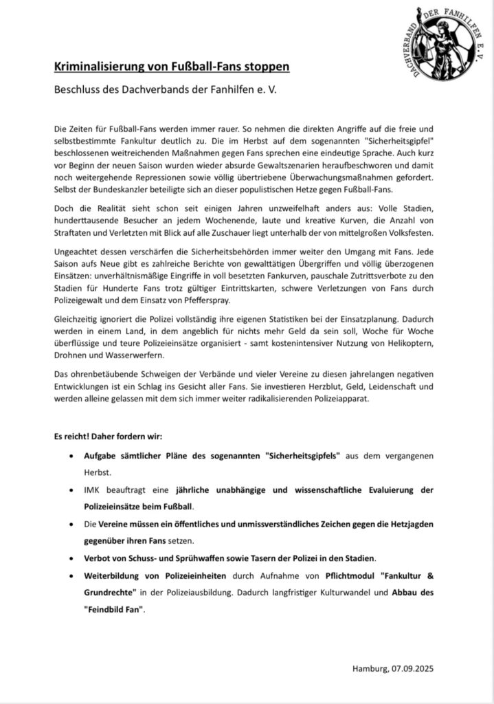 Faszination Fankurve dokumentiert die Stellungnahme sowie den Beschluss des Dachverbands der Fanhilfen: