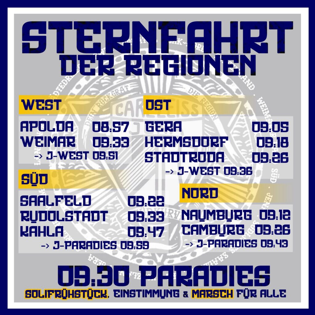 Dafür wurden nun Verbindungen aus allen Richtungen veröffentlicht, mit denen die Sektionen am Samstag nach Jena anreisen. Aus Richtung Westen wurden Zeiten für die Bahnhöfe in Apolda und Weimar herausgegeben. Aus Richtung Norden für die Städte Naumburg und Camburg. Aus Richtung Osten für Gera, Hermsdorf und Stadtroda und aus dem Süden für die Städte Saalfeld, Rudolstadt und Kahla.