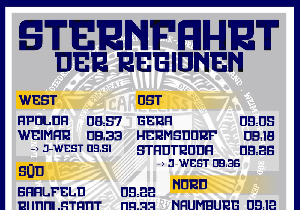 So auch zum nächsten Heimspiel gegen den FC Eilenburg, das am Samstag um 14:00 stattfindet. Für diese Partie mobilisiert die Südkurve Jena nun für eine Sternfahrt aus allen Himmelsrichtungen, um weitere Leute in die Regionsstrukturen zu integrieren.