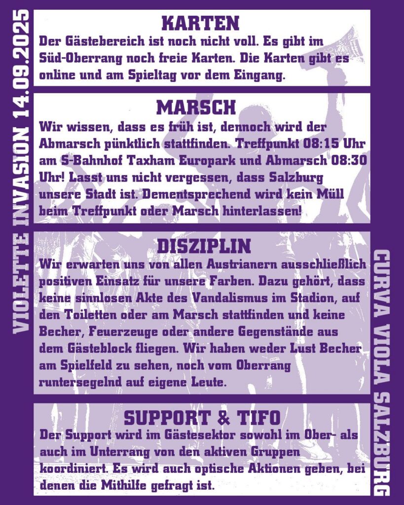 Die Curva Viola Salzburg rief vorab zur „Violetten Invasion“ auf und mobilisierte zu einem gemeinsamen Marsch. Treffpunkt war um 8:30 Uhr am S-Bahnhof Taxham Europark. Außerdem rief man dazu auf, in Violett zu erscheinen.