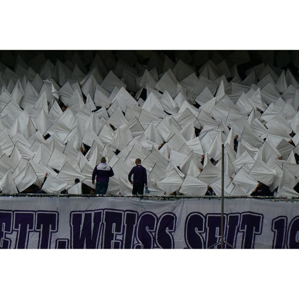 Im Stadion präsentierten die Gästefans eine Choreografie unter dem Motto „Violett-Weiß seit 1933“. Zum Spruchband mit ebenjener Botschaft gab es zahlreiche Schwenkfahnen und Rauch in den Vereinsfarben. Während des Spiels untermalten weitere Rauchtöpfe die Gesänge.