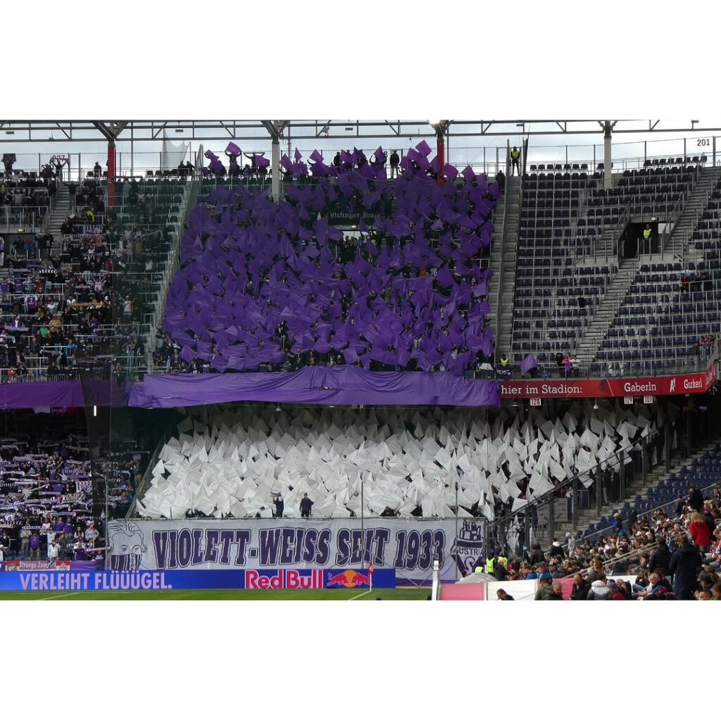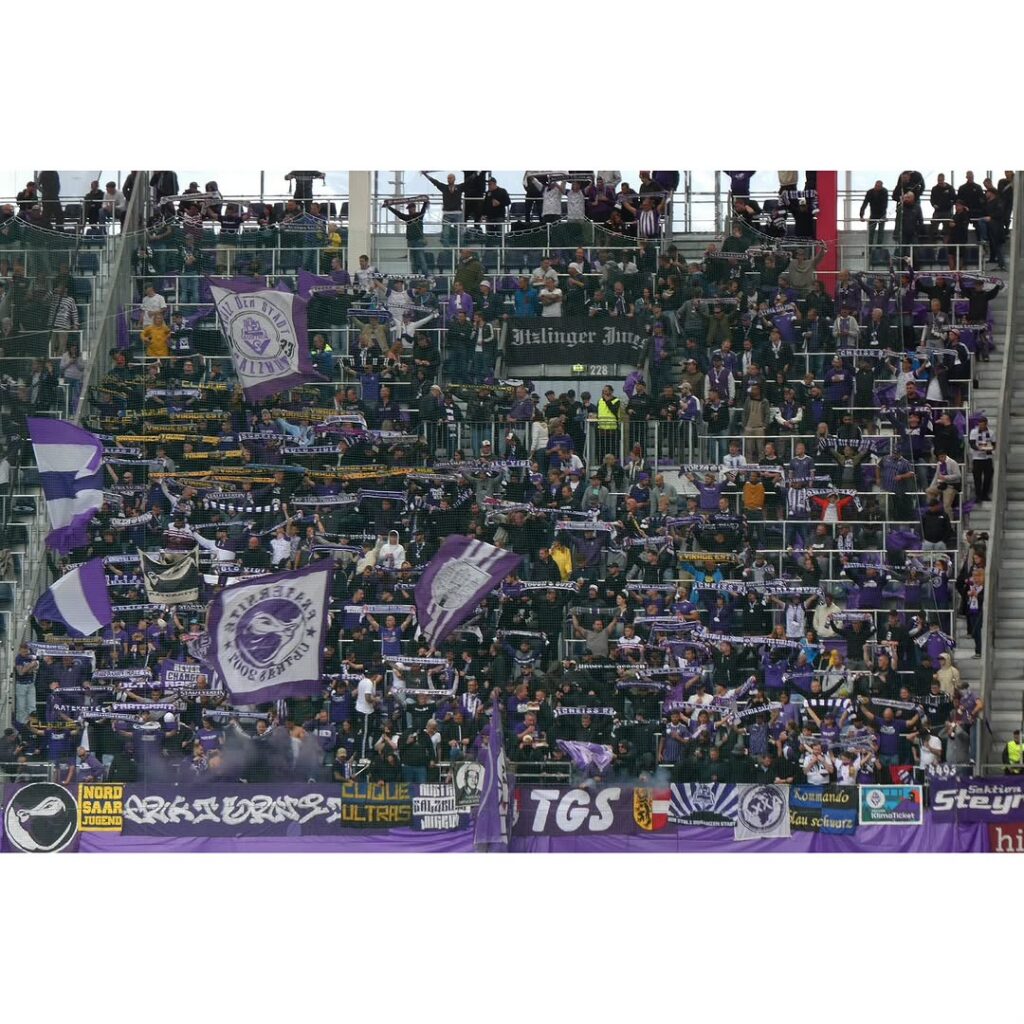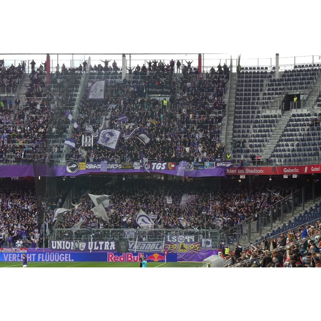 Vergangenen Sonntag gastierte Aufsteiger Austria Salzburg beim FC Liefering, der unter der Kontrolle von Red Bull steht. Das Spiel wurde im Stadion von Red Bull ausgetragen. Eine gigantische Masse an violetten Fans begleitete die Austria zu diesem Spiel und sorgte damit für einen neuen Zuschauerrekord in Österreichs zweiter Liga. Begleitet wurde die Partie von eindrucksvollen Fan-Aktionen der Violetten. (Faszination Fankurve, 17.09.2025)