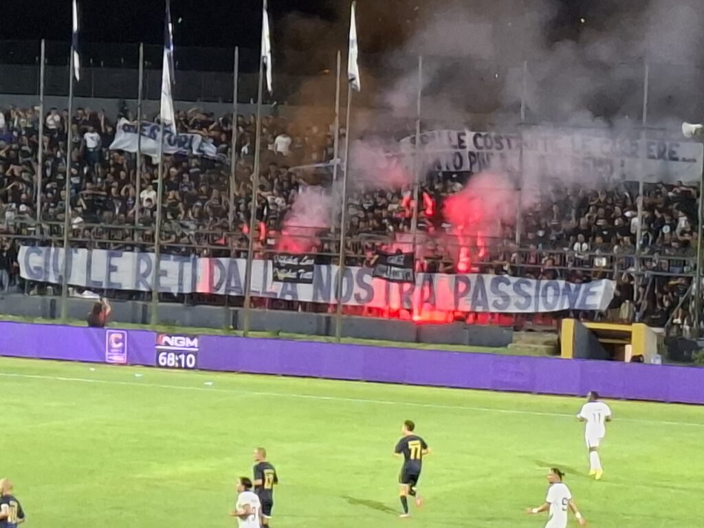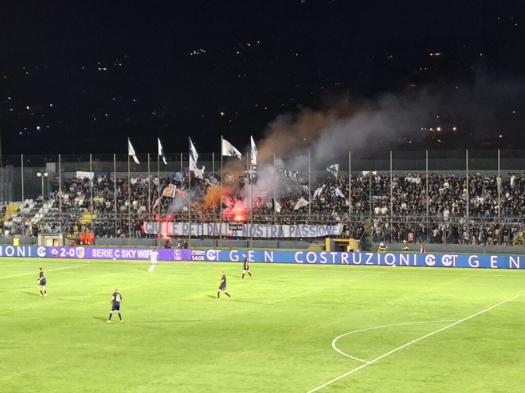 Die aktive Szene entschied sich daraufhin, das Spiel von dort aus aktiv – jedoch ohne Zaunfahnen – zu verfolgen. Hinter dem Spruchband „GIÙ LE RETI DALLA NOSTRA PASSIONE“ („SENKT DIE NETZE FÜR UNSERE LEIDENSCHAFT“) unterstützte man die Mannschaft geschlossen mit lautstarken Gesängen, mehreren kleineren Fahnen und zahlreichen bengalischen Fackeln.